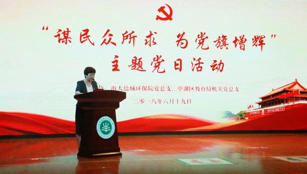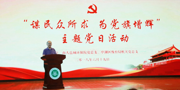 亭湖区教育局党委副书记乘红对活动工作作了总结讲话。她说,今天我局机关党总支与南大盐城环保院党总支联合举办主题党日活动,这是党建工作的一次创新。活动把亭湖区教育系统、环科城、南大盐城环保院紧密联合在一起,把教育与环保行业特点有机统一在一起,形成相互促进、相互支持的合力。南大盐城环保院党总支在环科城实验学校设立“绿色先锋助学基金”,共建“环保行为养成教育基地”是两个基层党委组织携手共进、增进民众福祉的开端。希望以本次活动为起点,创新活动特色,丰富活动内涵,抬高发展质量,增强党员干部党性修养的整治自觉,积极投身伟大时代的伟大事业,为实现两个“一百年”奋斗目标作出更大的贡献。