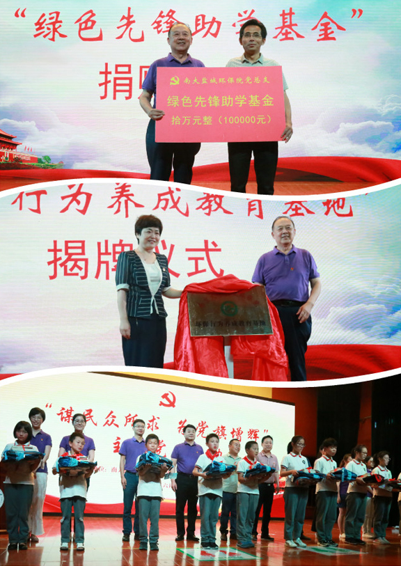 随后,分别进行了南京大学盐城环保院向环科城实验学校捐赠“绿色先锋助学基金”、双方共建“环保行为养成教育基地”仪式,以及党员向学生赠送红色教育书籍及学习用品活动。真真切切的关心,实实在在的举动,赢得全场一阵又一阵的掌声。