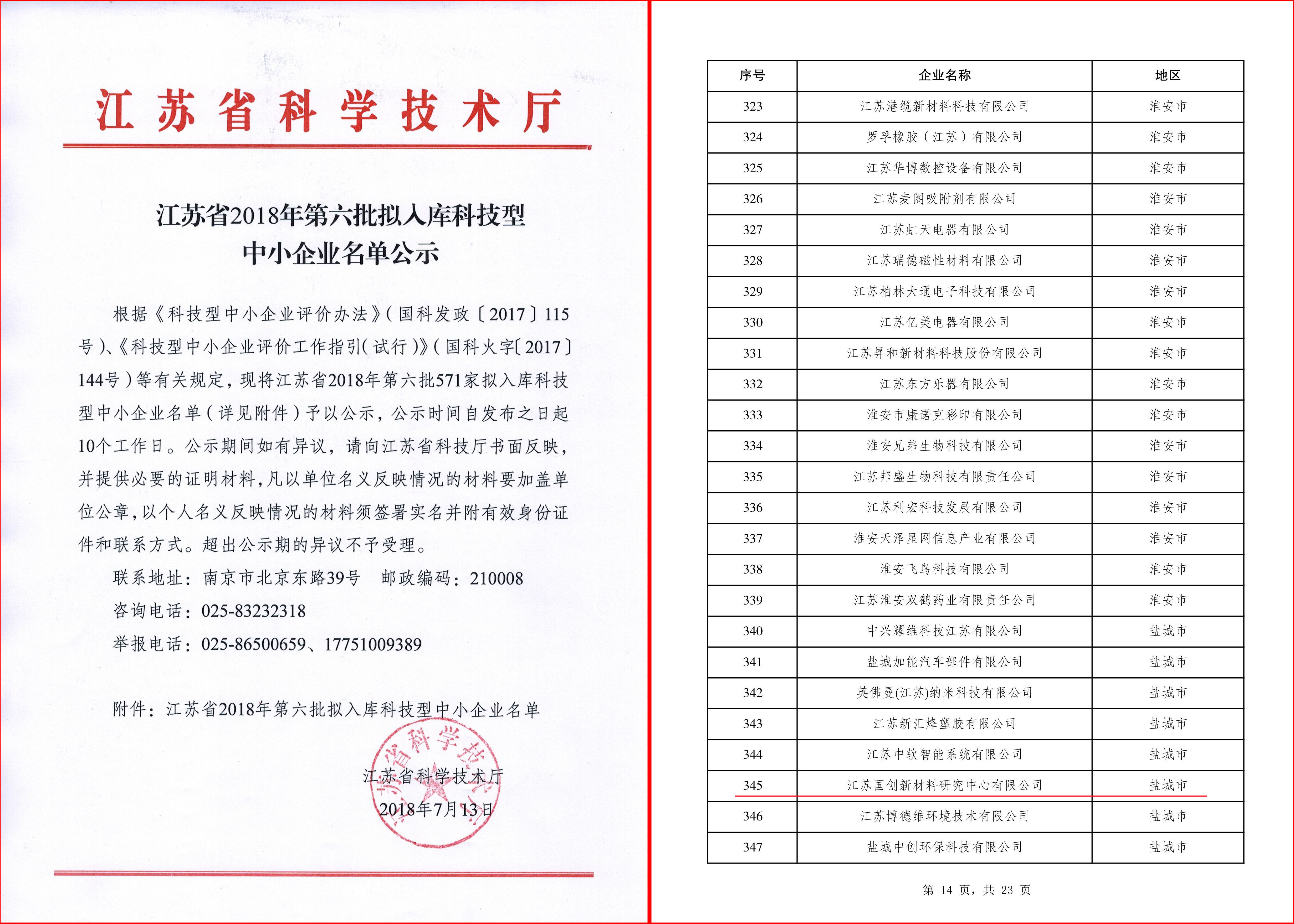 喜讯!江苏国创新材料研究中心有限公司成功入选江苏省2018年第六批拟入库科技型中小企业